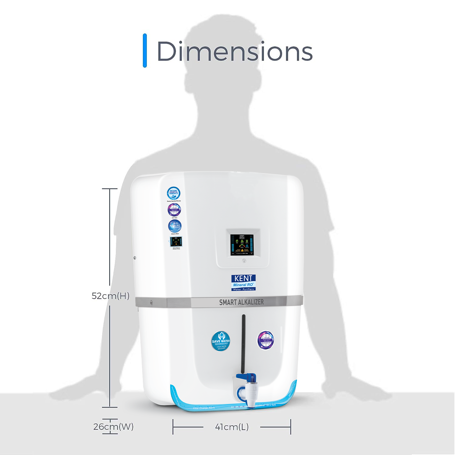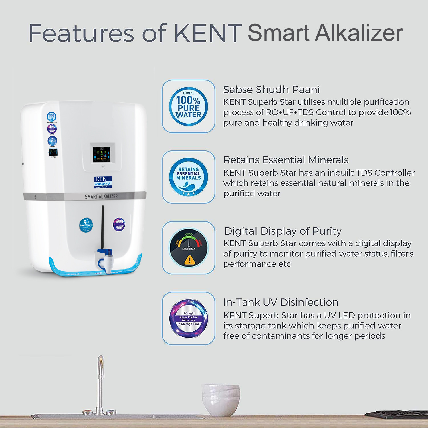 Bring home all new KENT Smart Alkalizer , a technologically advanced RO Water Purifier with Digital Display Alkaline that enhances the pH level of the purified water up to 9.5. It utilises multiple purification process of RO+UV+UF+TDS Control+Alkaline+Digital display to make water 100% pure while retaining essential natural minerals in the purified water. Also, the storage tank comes with UV LED light that keeps purified water bacteria free and pure. Equipped with Zero Water Wastage Technology, this purifier recirculates water to the overhead tank, leading to no wastage of water.