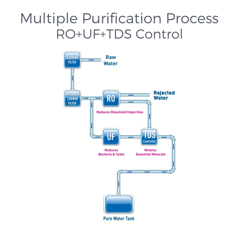 The multiple purification process of RO+UF+TDS Control makes water 100% pure and suitable for drinking.