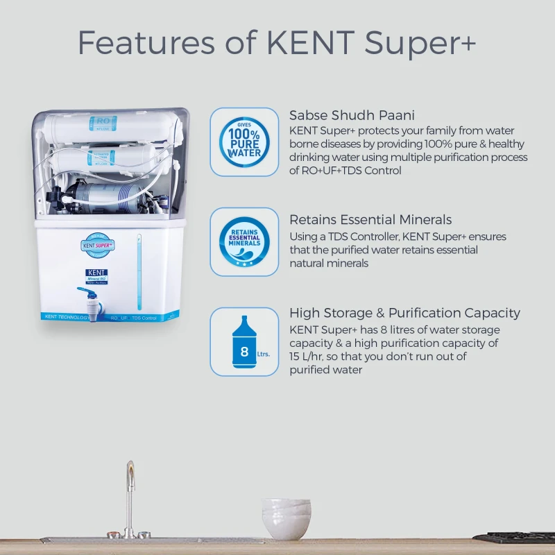 KENT’s compact RO Water purifier- KENT Super+ uses multiple purification process of RO+UF+TDS Control to provide 100% pure drinking water. Stylishly designed as wall mountable, this purifier utilises KENT’s Mineral ROTM technology to retain essential natural minerals in the purified water using a TDS Controller. Suitable for purifying brackish, tap water and municipal water supply, this purifier is ideal for domestic purposes.